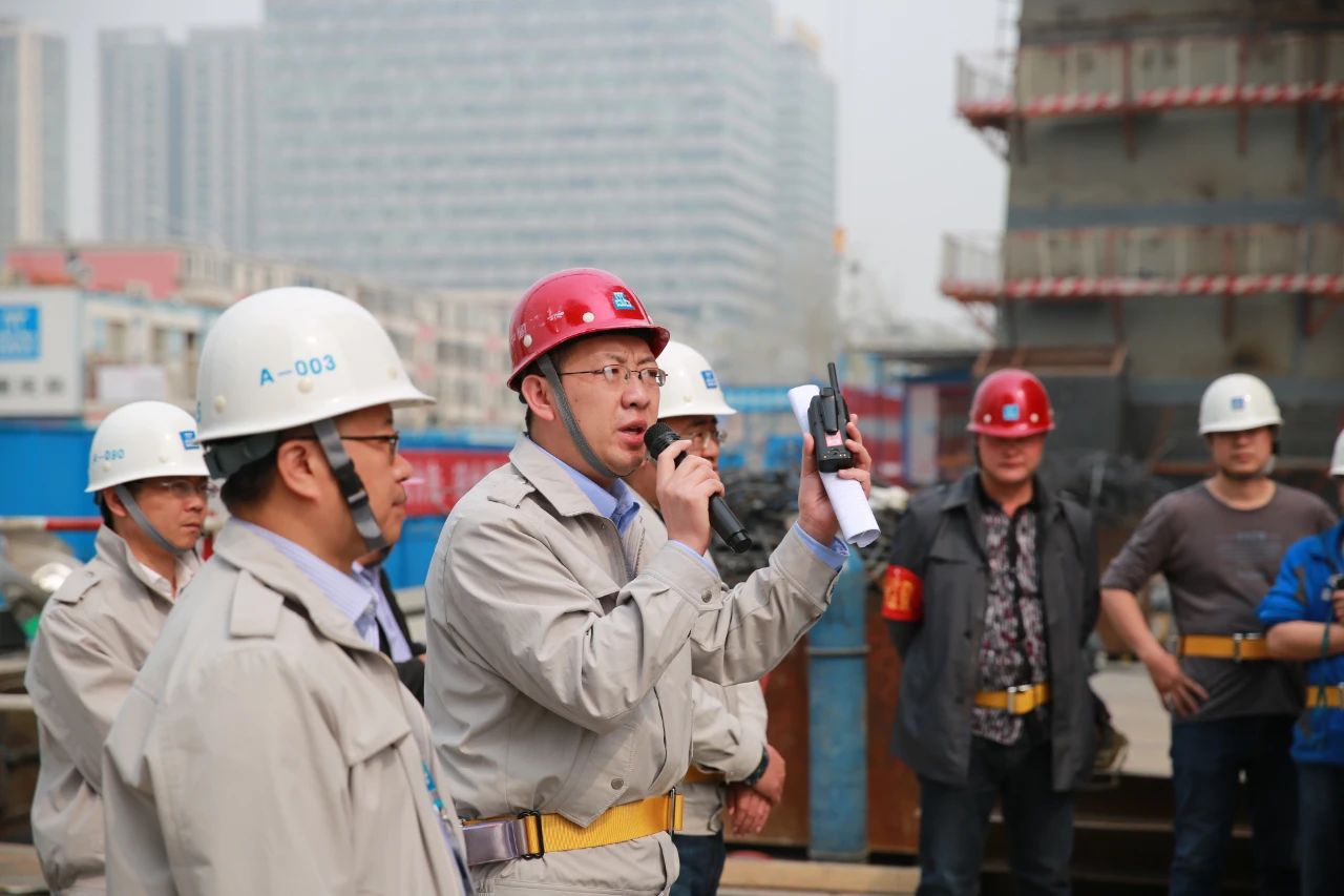 图为王开强(右2)在沈阳宝能环球金融中心项目向国外考察专家介绍“空中造楼机”