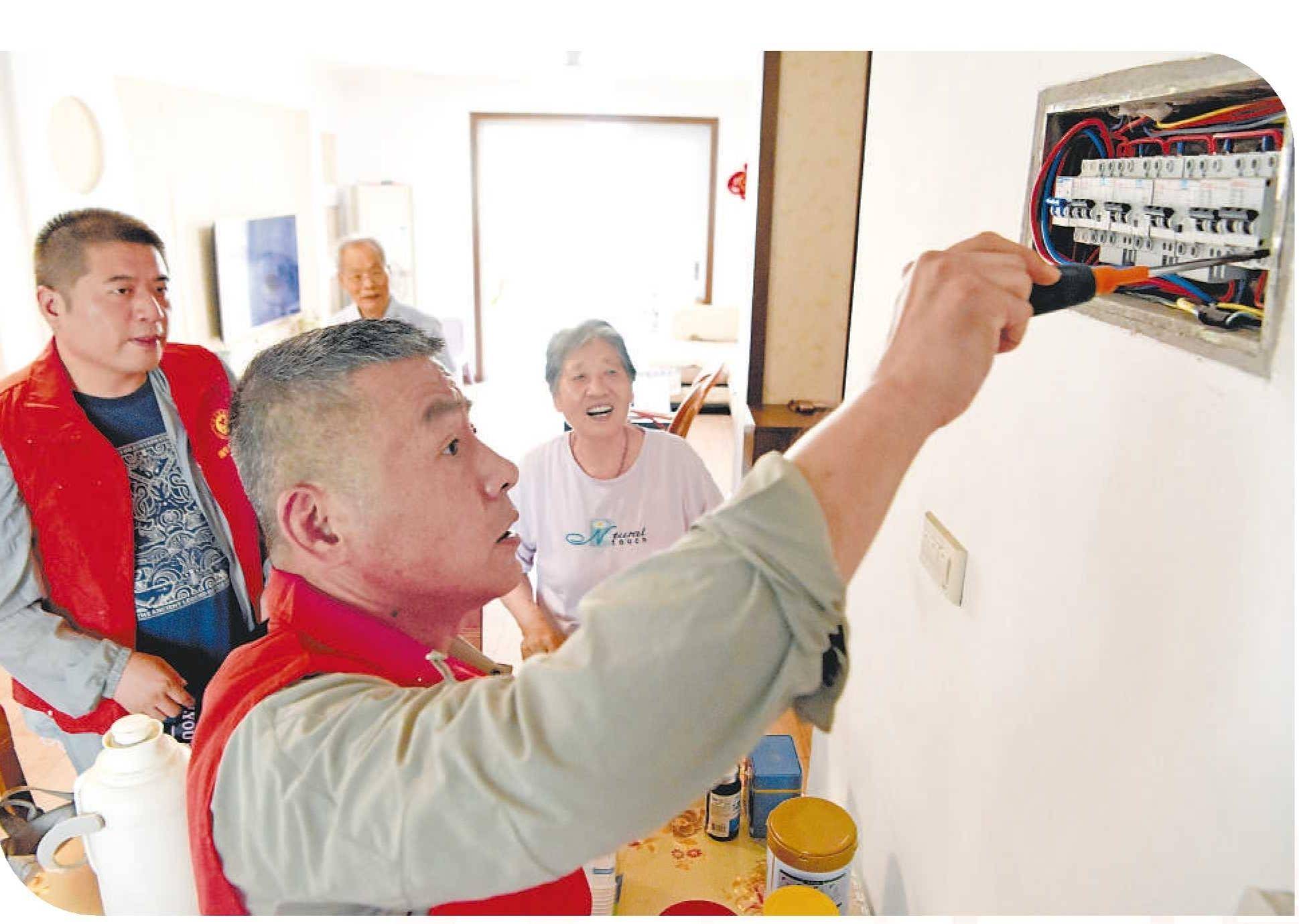 在淮南市谢家集区平山街道瑞安社区,志愿者为老人住所检修电路。视觉中国供图