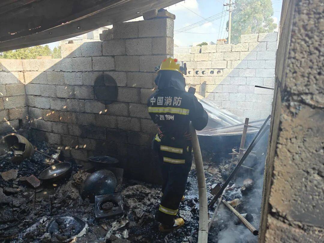 10月9日,贺州市富川县石家乡牛角井村一厨房发生火灾。接到报警后,贺州指挥中心立即调派福利镇消防救援站赶赴现场处置。消防救援人员到达现场时,火势已蔓延至屋外。半个小时后,火势被扑灭。